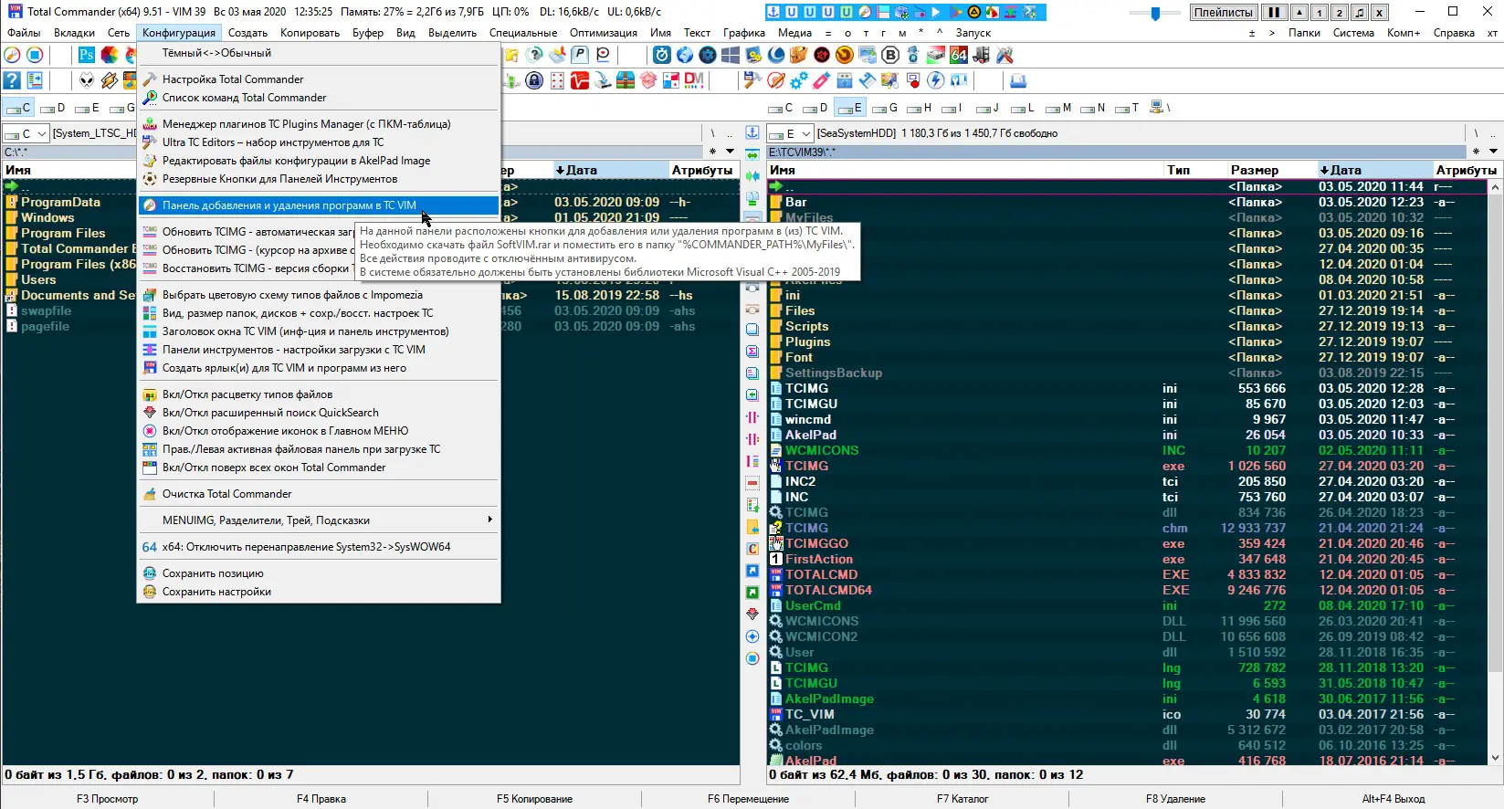 После запуска сборки пользователь получает доступ к двум панелям для навигации по файловой системе, что является визитной карточкой Total Commander. Работа с файлами осуществляется через стандартные операции копирования, перемещения, переименования и удаления, но с расширенными возможностями благодаря встроенным плагинам. Например, можно просматривать содержимое архивов без распаковки, извлекать метаданные из изображений или музыкальных файлов, а также быстро редактировать текстовые документы с помощью интегрированного редактора. Утилита TCIMG позволяет настраивать внешний вид, управлять подключёнными программами и автоматизировать рутинные задачи. Главное меню включает команды для активации и деактивации компонентов, обновления TCIMG и настройки дополнительных панелей инструментов в заголовке окна. Пользователи могут добавлять собственные команды, настраивать сочетания клавиш и изменять расположение элементов интерфейса под свои нужды.