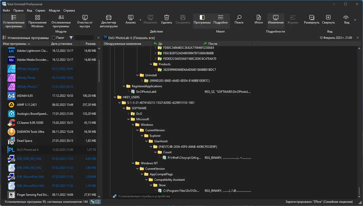 - Обеспечивается детальный анализ установленных приложений с возможностью просмотра всех внесённых изменений.