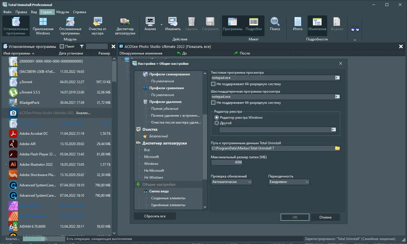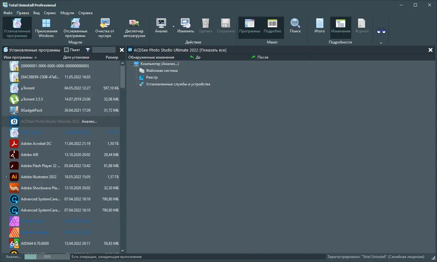 Total Uninstall — это мощный инструмент для полного и безопасного удаления программ из операционной системы. В отличие от стандартного деинсталлятора Windows, этот tool анализирует изменения, внесённые приложением при установке, и удаляет не только основные файлы, но и следы в реестре, папки в системных директориях, а также связанные службы и записи в автозагрузке. Программа работает в двух режимах: мониторинг новых установок и анализ уже установленных приложений. Благодаря детальному сравнению состояния системы до и после инсталляции, обеспечивается чистое удаление без остатков.