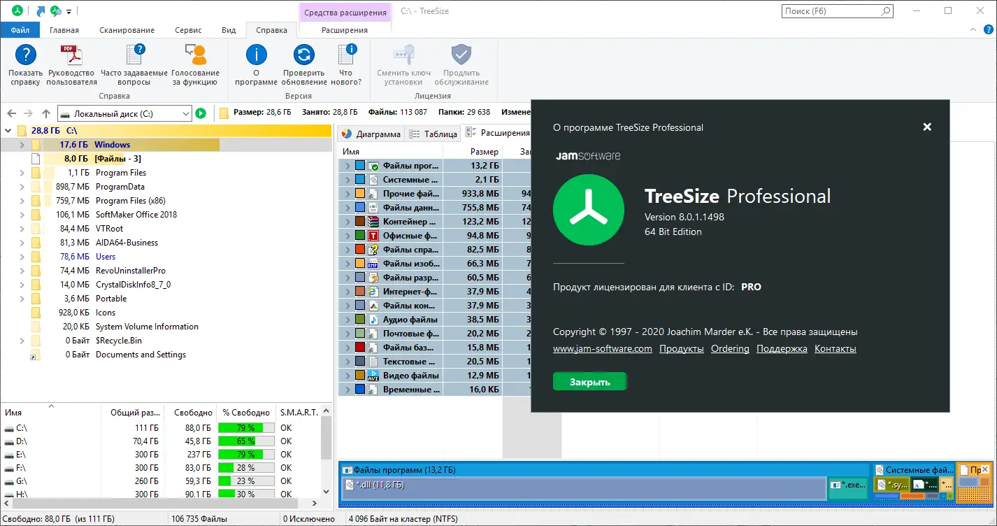 TreeSize Professional — это инструмент для анализа и управления занимаемым местом на жёстких дисках в операционных системах Windows. Программа отображает структуру каталогов с детализацией по размеру, датам, правам доступа и другим параметрам. Визуализация данных и расширенные функции поиска позволяют быстро находить объёмные и устаревшие файлы, оптимизируя дисковое пространство.
