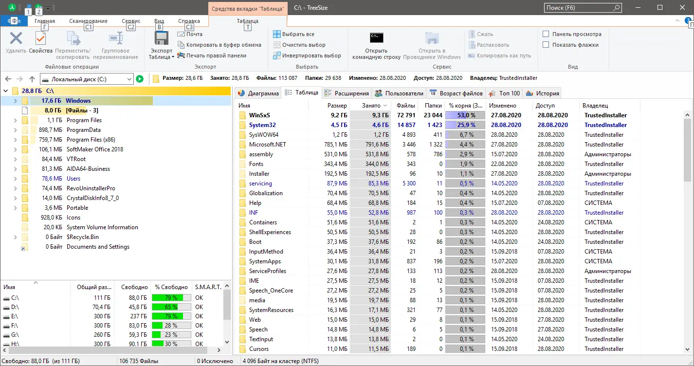 TreeSize сочетает высокую производительность и детальную аналитику, что делает его профессиональным решением для администрирования файловых систем.