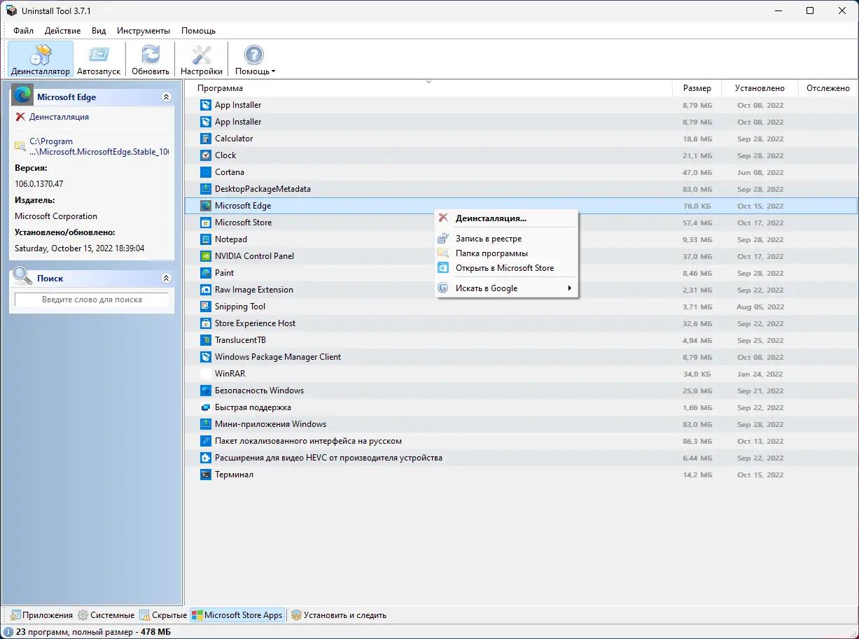 - Позволяет полностью удалять программы, включая скрытые и повреждённые записи.