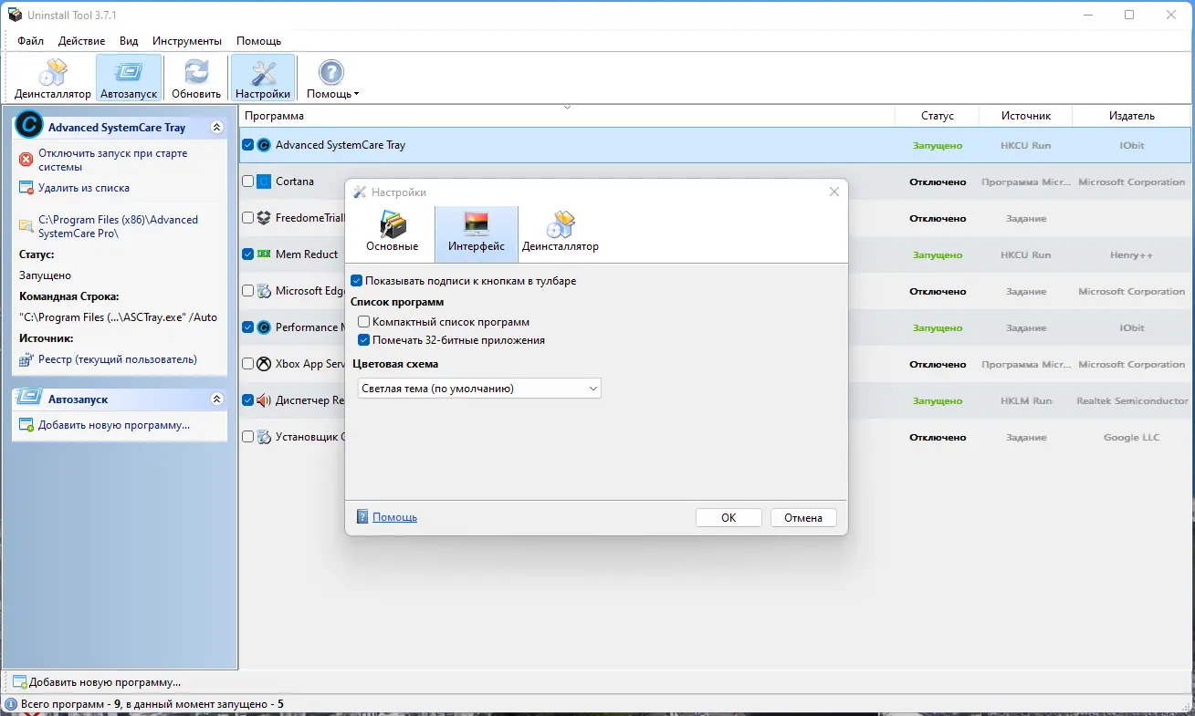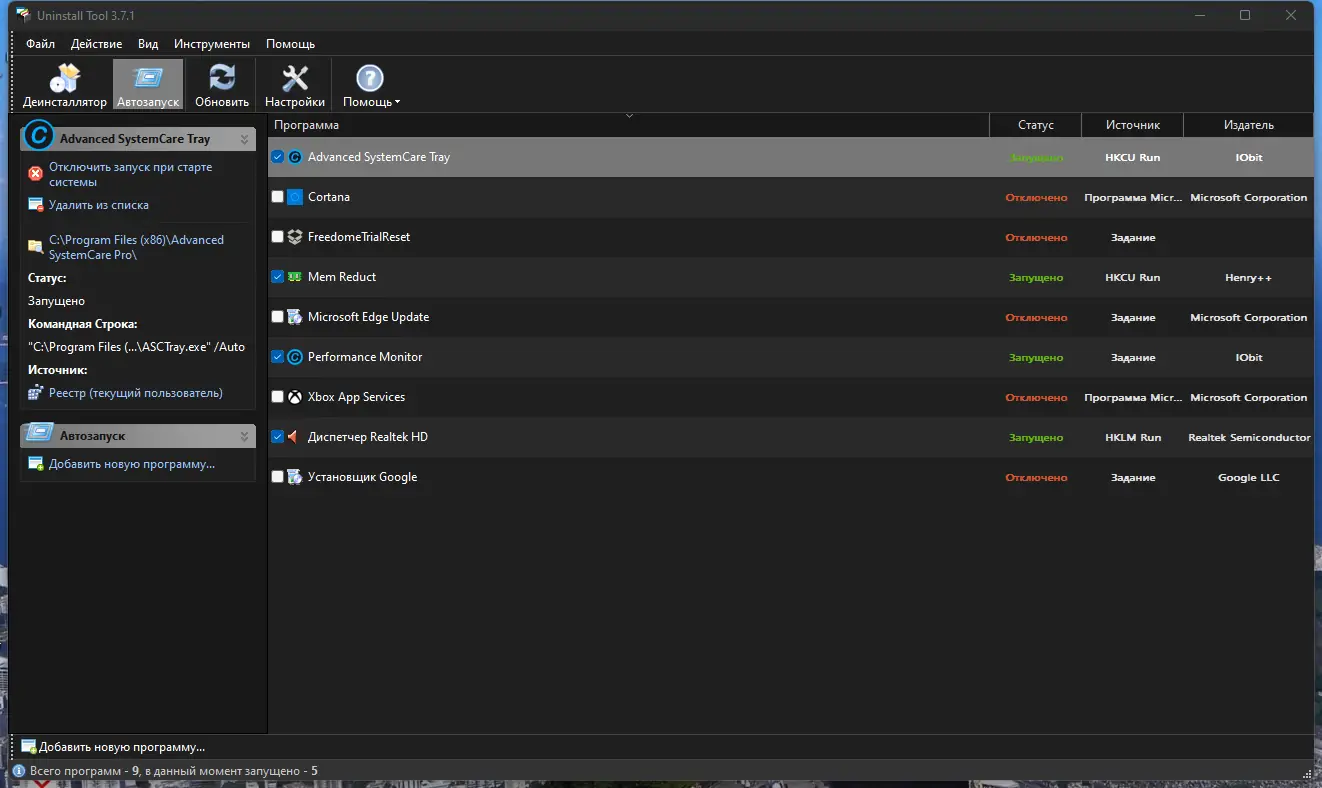 - Управление программами автозагрузки с возможностью просмотра детальной информации и отключения нежелательных элементов.