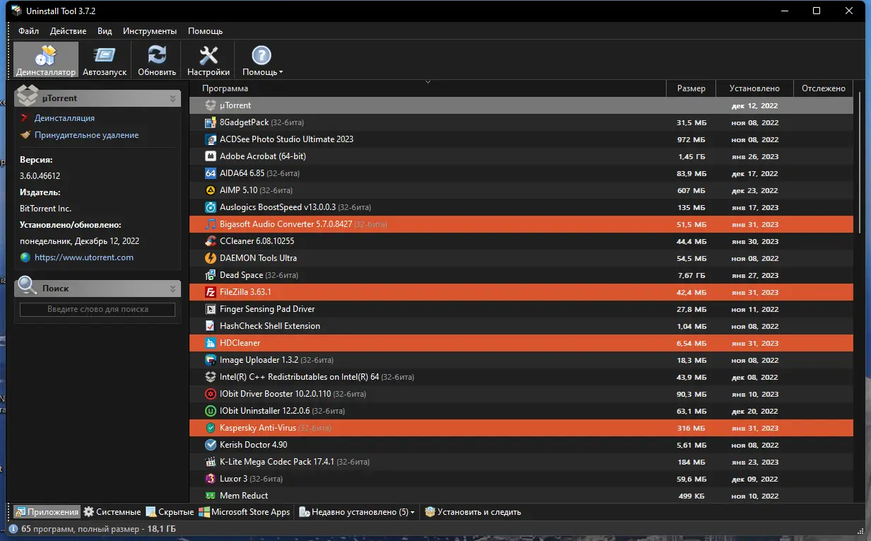 - Высокая скорость и точность при удалении программ и их остатков.