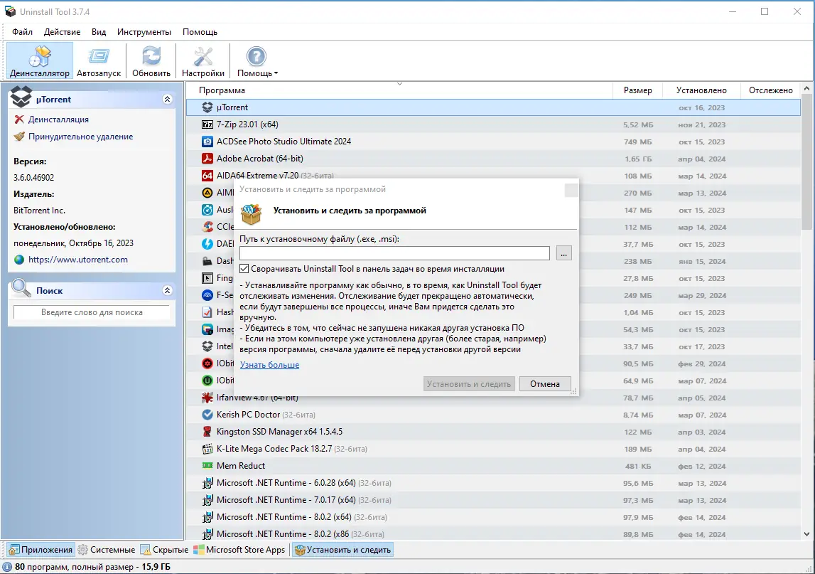 Uninstall Tool — это альтернатива стандартному деинсталлятору Windows, разработанная для более тщательного и быстрого удаления программ. Утилита эффективно справляется с приложениями, которые не удаляются обычными методами, включая те, что оставляют после себя файлы, папки и записи в реестре. Она поддерживает мониторинг установки программ, что позволяет отслеживать все изменения в системе с момента инсталляции и полностью их устранить при удалении. Программа обладает высокой точностью и безопасностью, позволяя пользователю контролировать каждый этап деинсталляции. Её возможности особенно полезны при оптимизации системы и подготовке компьютера к чистой переустановке ОС.