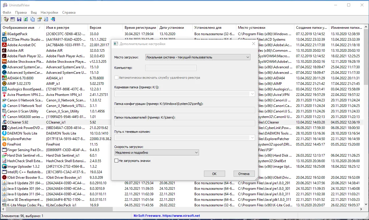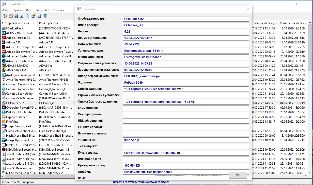- Утилита собирает данные из реестра Windows, включая записи о давно удалённых, но не до конца очищенных программах