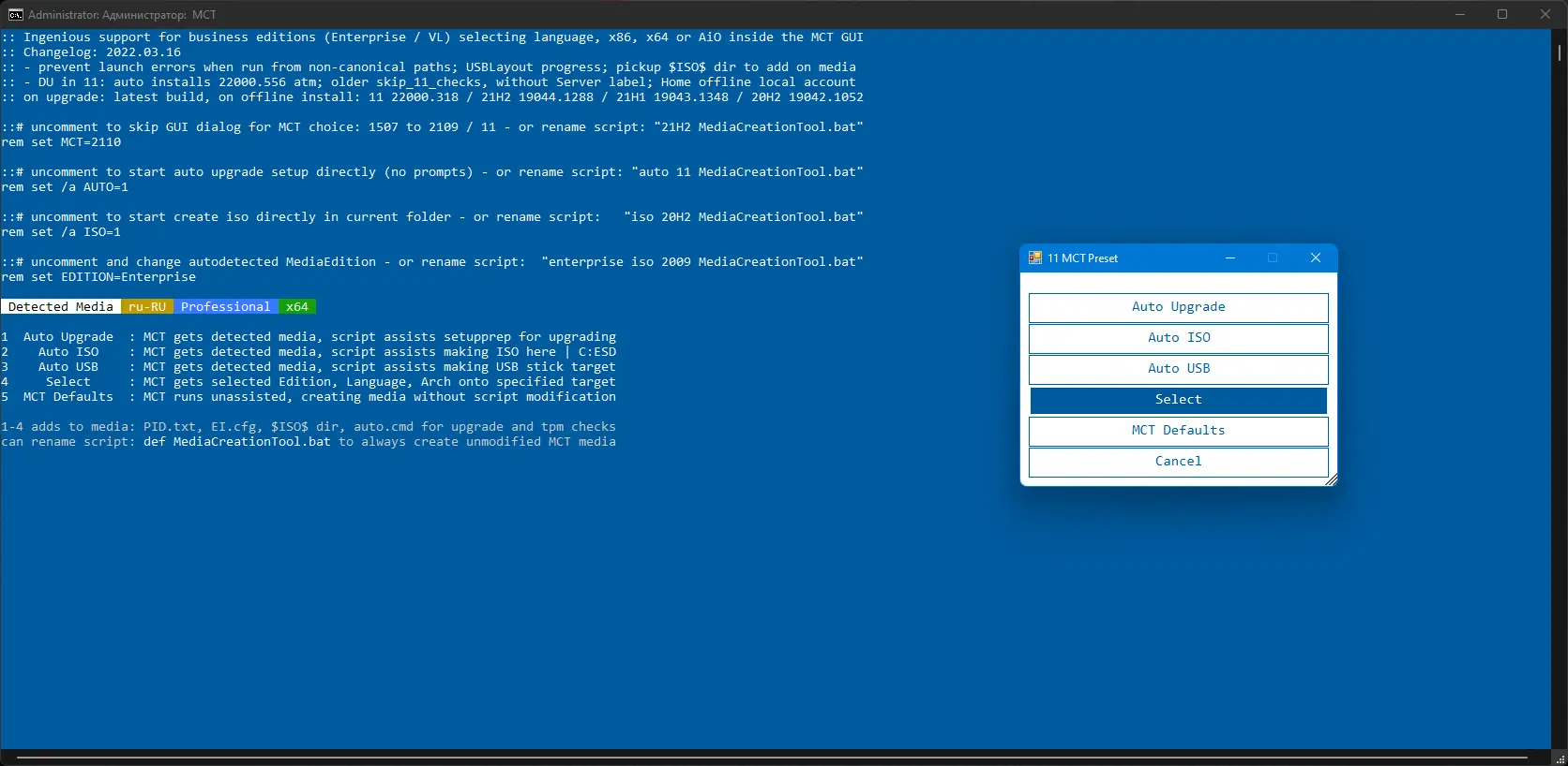 Использование утилиты простое и не требует глубоких технических знаний. Для начала нужно запустить файл MediaCreationTool.bat от имени администратора. После запуска появляется меню, где пользователь выбирает нужную версию ОС — в данном случае 11. Далее доступны несколько опций: автоматическое обновление, создание ISO-образа или загрузочного USB-накопителя. При выборе опции Select можно указать конкретную редакцию и язык системы. Опция MCT Defaults позволяет создать оригинальный установочный носитель без дополнительных скриптов. После завершения подготовки установочного носителя можно приступать к установке или обновлению системы на компьютере. Процесс проходит в стандартном режиме, аналогичном работе официального установщика, но без блокировок по системным требованиям.
