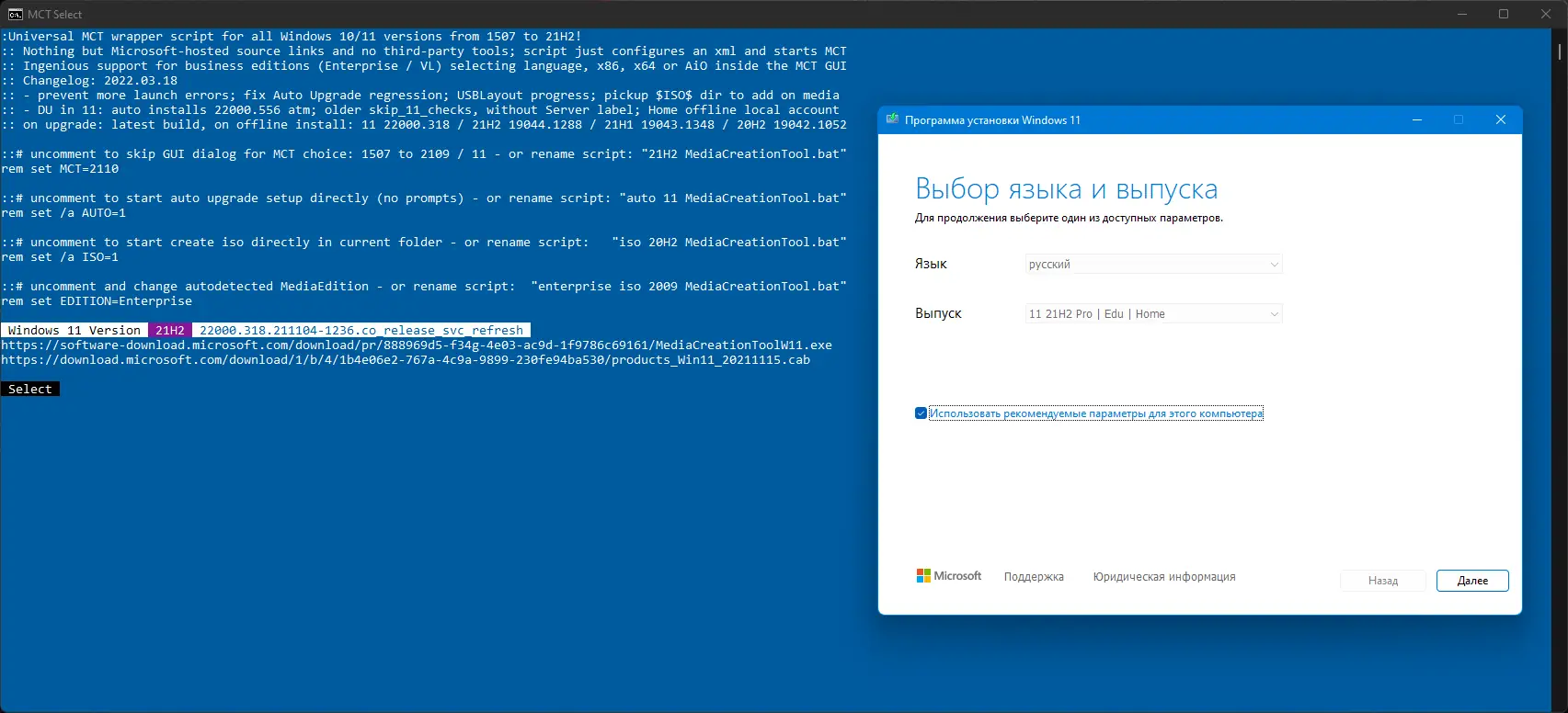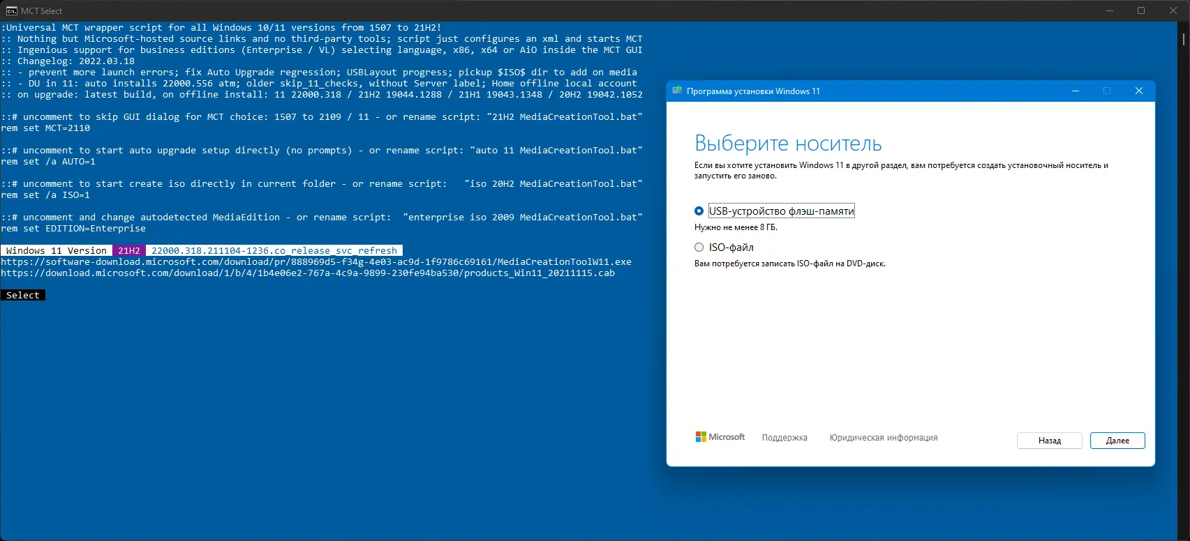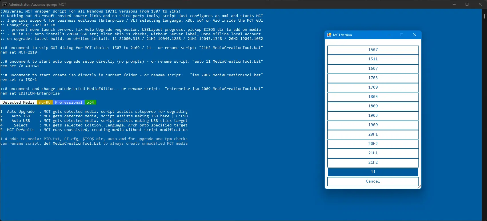 Использование утилиты не требует глубоких технических знаний. После запуска файла MediaCreationTool.bat пользователь видит меню с несколькими опциями. Выбирается нужная версия ОС — в данном случае 11. Далее доступны варианты действий: автоматическое обновление, создание ISO-образа или подготовка загрузочного USB-накопителя. При выборе опции Select можно указать конкретную редакцию и язык. Опция MCT Defaults позволяет создать оригинальный носитель без модификаций. После завершения подготовки установка выполняется стандартным образом — через перезагрузку с носителя или в фоне.