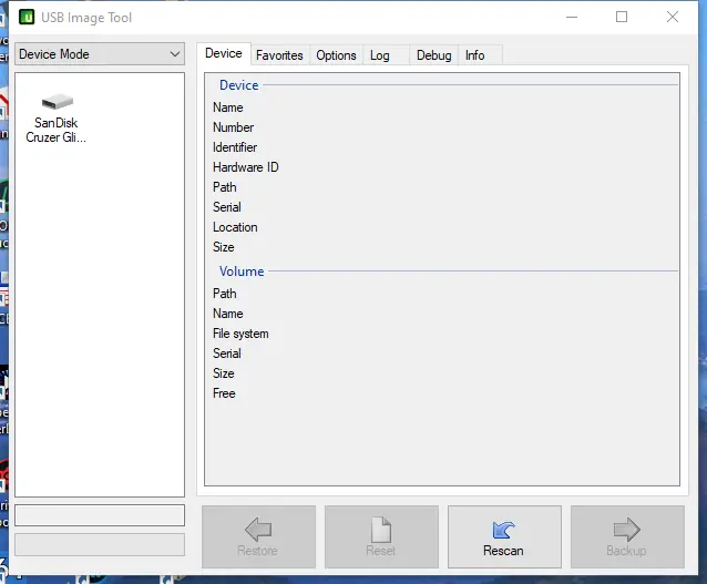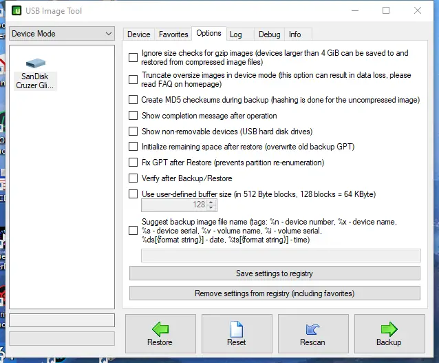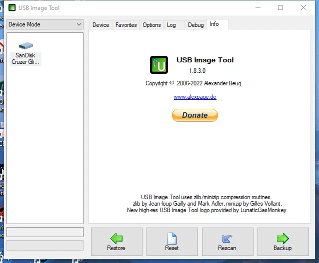 Интерфейс утилиты минималистичен и интуитивно понятен. После подключения USB-устройства оно автоматически отображается в основном окне. Пользователь выбирает нужное устройство, указывает путь для сохранения образа и запускает процесс копирования. Для сжатых образов используется формат .imz, совместимый с встроенной поддержкой zip. Восстановление выполняется аналогично — выбирается образ и целевое устройство. Также доступна команда Reset, позволяющая вернуть флешку к исходному состоянию, если операционная система не распознаёт её полный объём. Работа из командной строки расширяет возможности автоматизации резервного копирования.