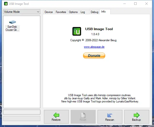 Интерфейс утилиты предельно прост: после запуска в главном окне отображаются все подключённые USB-устройства. Пользователь выбирает нужный накопитель, затем нажимает кнопку «Create» для создания образа. В процессе можно указать формат (IMG, IMA или IMZ), путь сохранения и включить сжатие. Для восстановления используется кнопка «Restore» — программа вернёт данные в исходное состояние, перезаписав весь контент на устройстве. Функция «Reset» позволяет переформатировать флешку, если система видит не весь объём. Также доступна работа с профилями, что удобно при частом резервировании нескольких устройств.