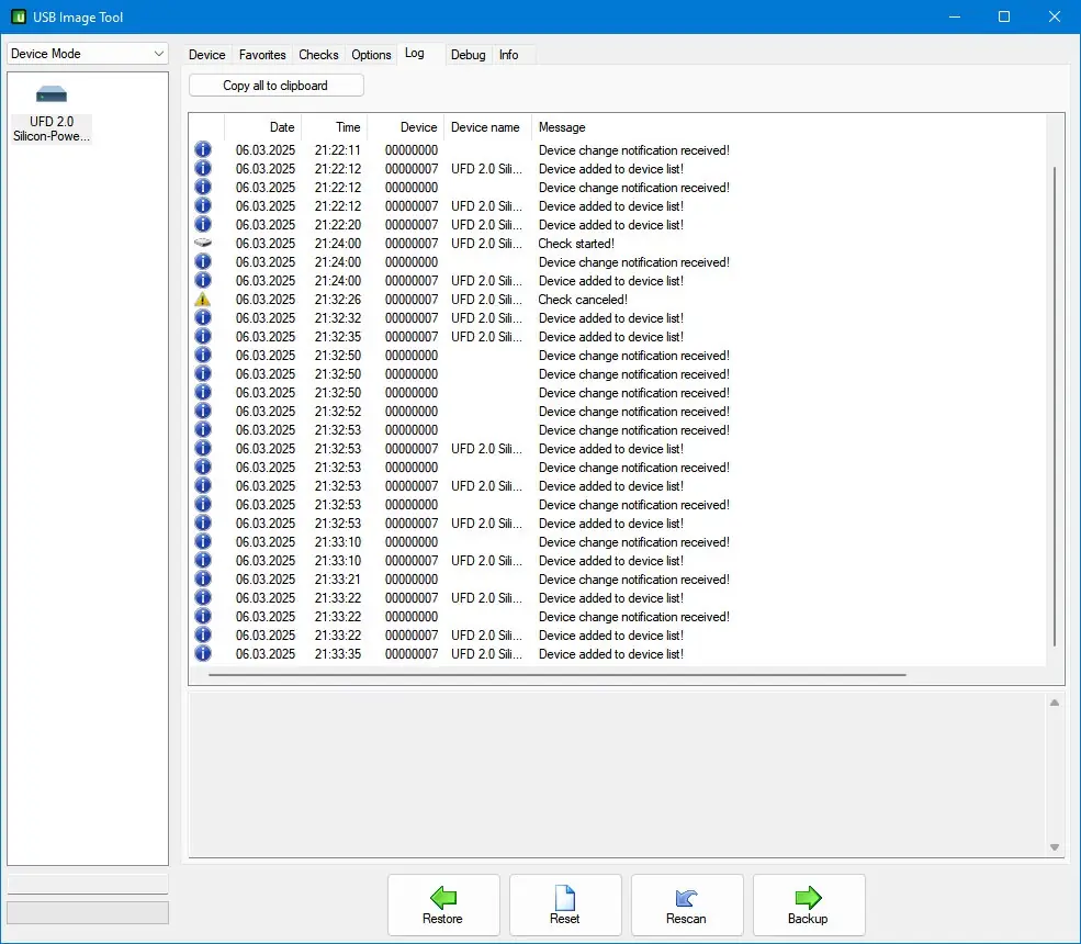 Интерфейс утилиты минималистичен и интуитивно понятен. После подключения USB-устройства оно автоматически отображается в основном окне. Для создания образа достаточно выбрать устройство, указать путь сохранения и нажать кнопку «Create». Восстановление выполняется аналогично — выбирается образ и целевой накопитель, затем запускается процесс записи. Функция Reset полезна в случаях, когда операционная система не распознаёт полный объём флешки из-за ошибок разметки или повреждённой файловой системы. Работа из командной строки позволяет интегрировать утилиту в скрипты и планировщики заданий.