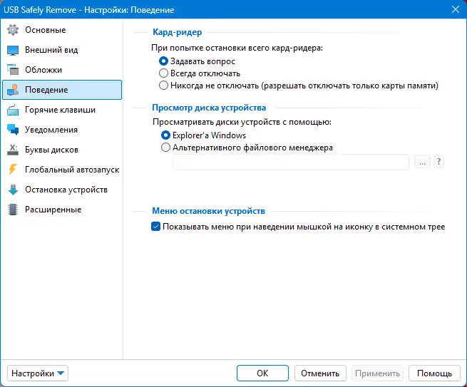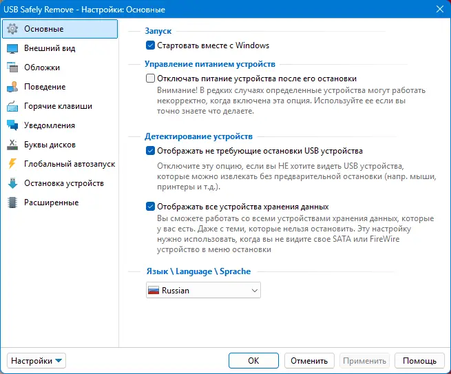 - Поддержка горячих клавиш для быстрого отключения носителей