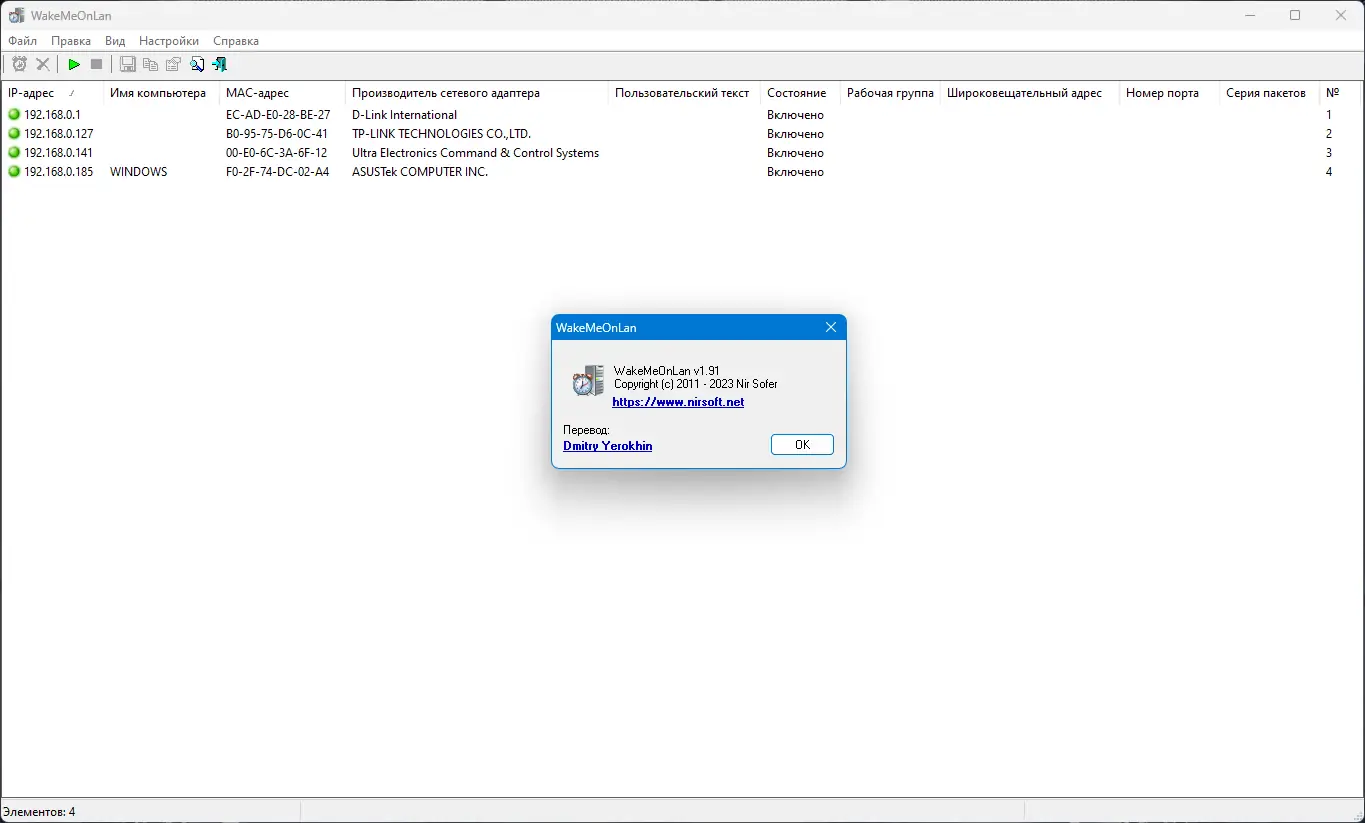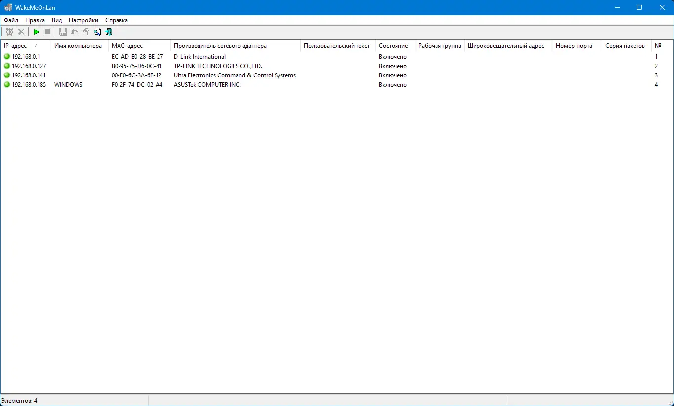 WakeMeOnLan — это легковесная утилита для удалённого включения компьютеров в локальной сети с помощью сигнала Wake-on-LAN. Программа позволяет сканировать сеть, собирать MAC-адреса устройств и запускать их из режима сна или выключенного состояния одним щелчком мыши. Поддержка командной строки делает её удобной для автоматизации задач.