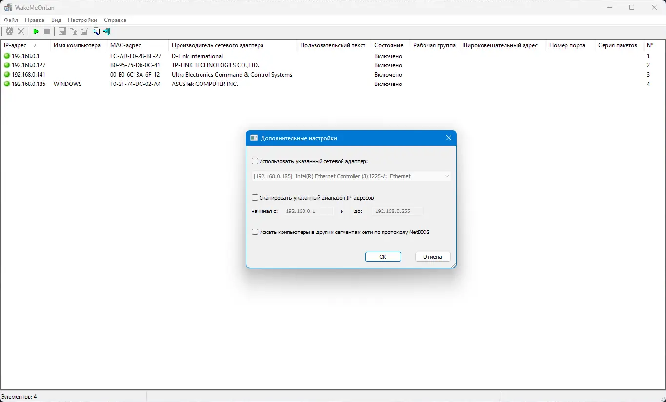 - Гибкие настройки отправки пакетов Wake-on-LAN, включая выбор широковещательного адреса