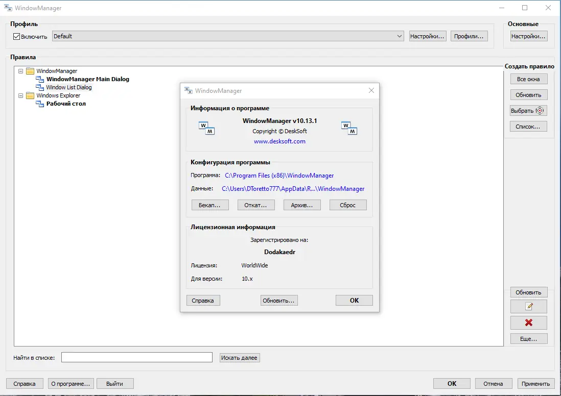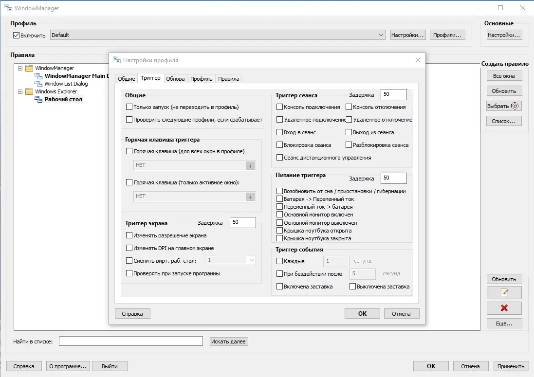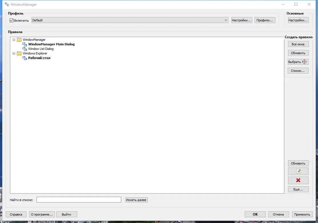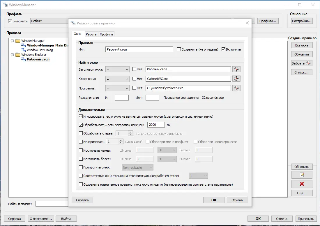 После установки WindowManager начинает автоматически отслеживать все появляющиеся окна. Пользователь может открыть настройки и создать правило для конкретного приложения или типа окна. В правиле указывается, какие действия должны выполняться: сохранение позиции, изменение размера, сворачивание, отправка в трей или активация по горячей клавише. Например, можно настроить, чтобы второе окно браузера всегда открывалось в определённой части экрана. Поддержка view в настройках позволяет точно указать, к какому элементу интерфейса применяется правило. Программа также поддерживает импорт и экспорт конфигураций, что удобно при настройке на нескольких компьютерах.