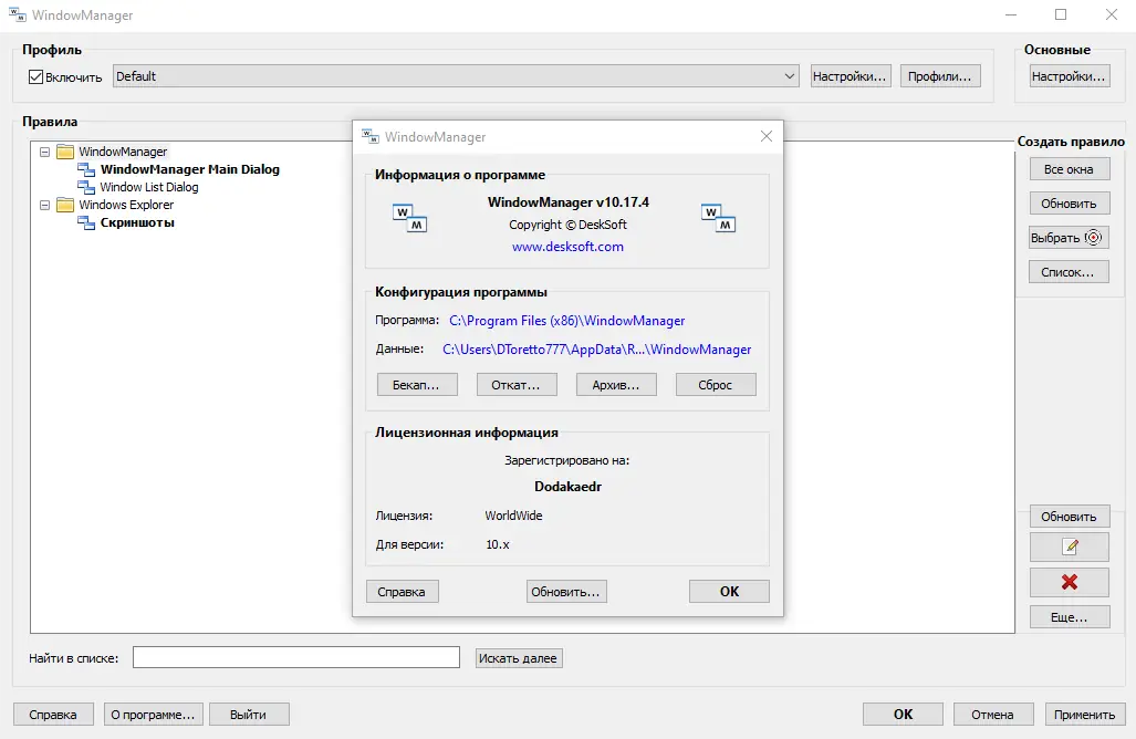 - Гибкая система правил для управления поведением окон по заголовку или процессу