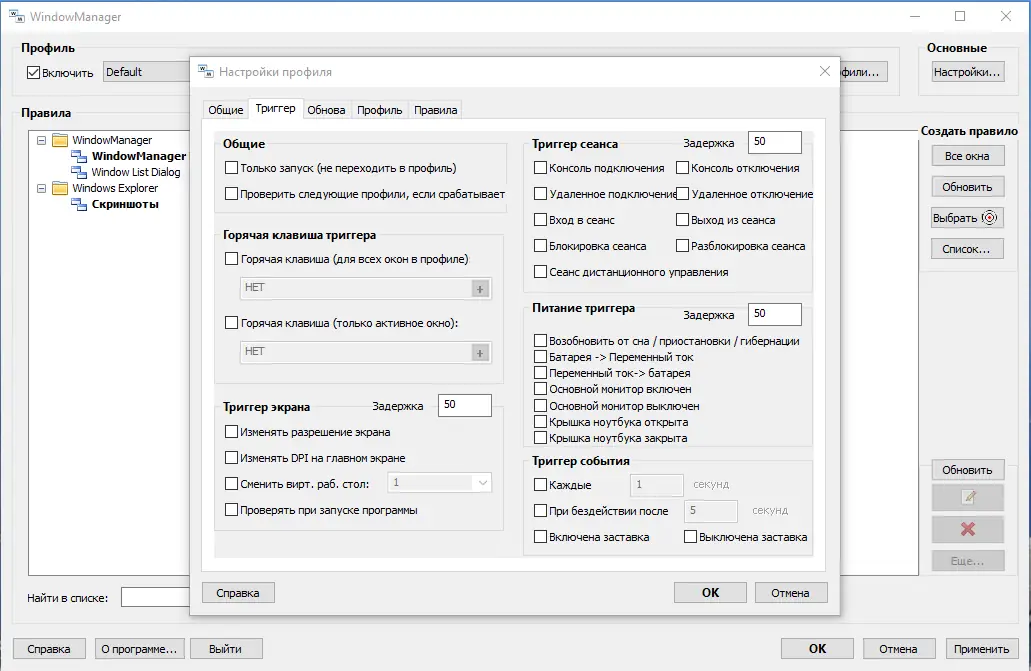 - Поддержка нескольких профилей и автоматическое переключение по триггерам