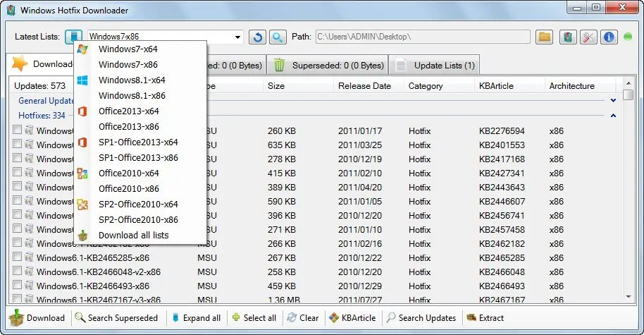 Hotfix Downloader — это бесплатная утилита для загрузки обновлений Windows 7, 8, 8.1, Office 2013 и Microsoft Runtimes на 32- и 64-битные системы. Программа удобна для сборщиков дистрибутивов, позволяя интегрировать пакеты обновлений в установочные образы.
