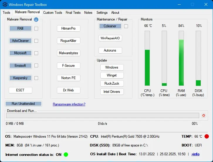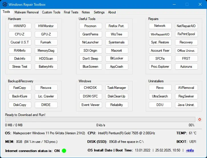 Repair Toolbox — это универсальная графическая оболочка, объединяющая под одной оболочкой множество бесплатных инструментов для обслуживания и восстановления операционных систем семейства Windows. Программа позволяет быстро находить, устанавливать и использовать утилиты от ведущих разработчиков в области системного администрирования. С её помощью можно эффективно решать задачи диагностики, очистки системы, управления автозагрузкой и удаления вредоносного ПО.
