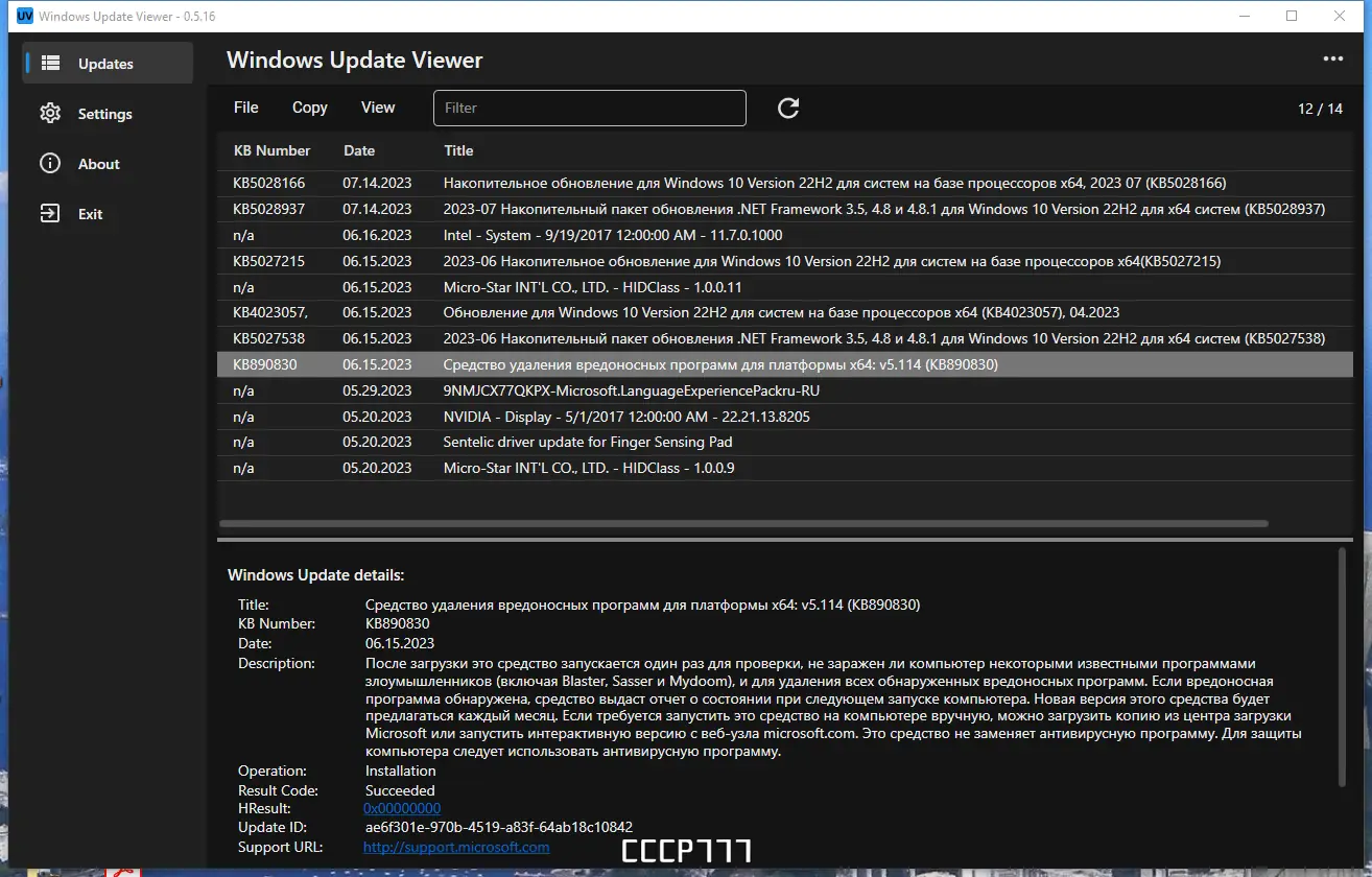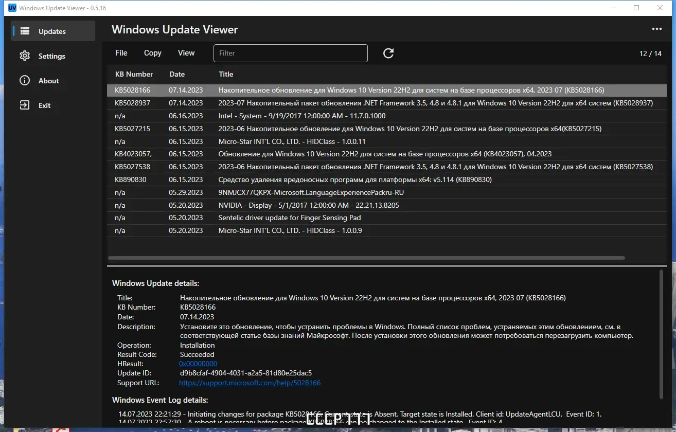 Update Viewer — это компактное приложение для просмотра информации об установленных обновлениях Windows. Программа использует внутренние API Центра обновления и системные журналы событий, позволяя детально анализировать установленные пакеты обновлений с привязкой к номерам базы знаний. Подходит для диагностики, аудита системы и контроля за процессом обновления операционной среды.