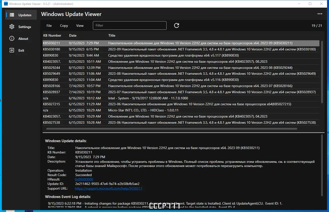 Update Viewer — это легковесная утилита для просмотра информации об установленных обновлениях Windows. Программа использует внутренние API Центра обновления и системные журналы событий, отображая данные в удобочитаемом виде с возможностью фильтрации, экспорта и быстрого доступа к сопутствующей информации.