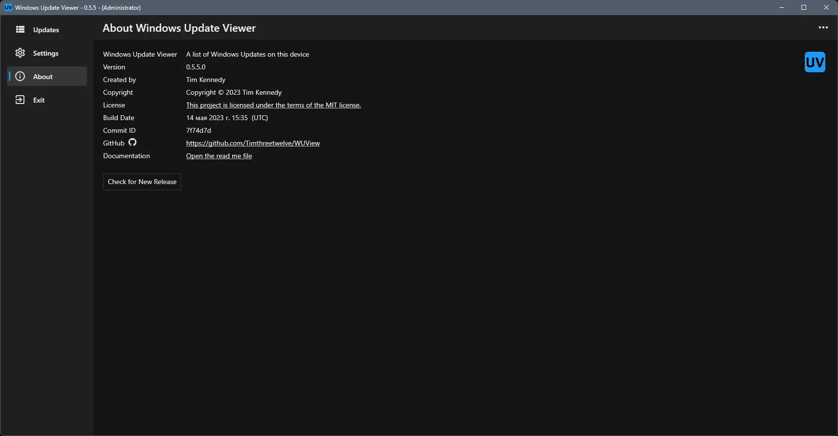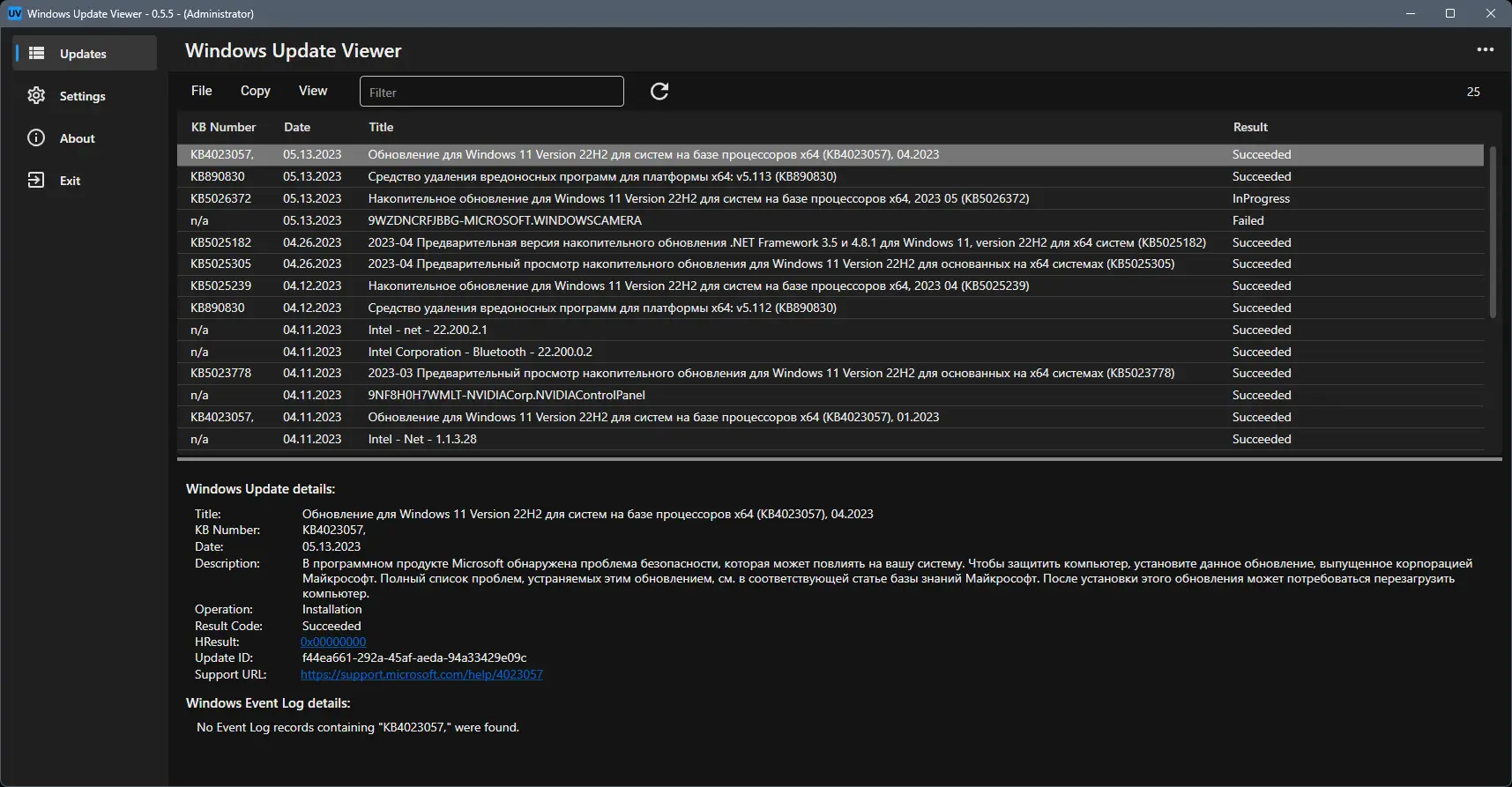 Update Viewer — это инструмент для просмотра установленных обновлений в системе windows, использующий внутренние API Центра обновления и системные журналы событий. Программа отображает детальную информацию о каждом обновлении, включая номера базы знаний, даты установки и ссылки на поддержку.
