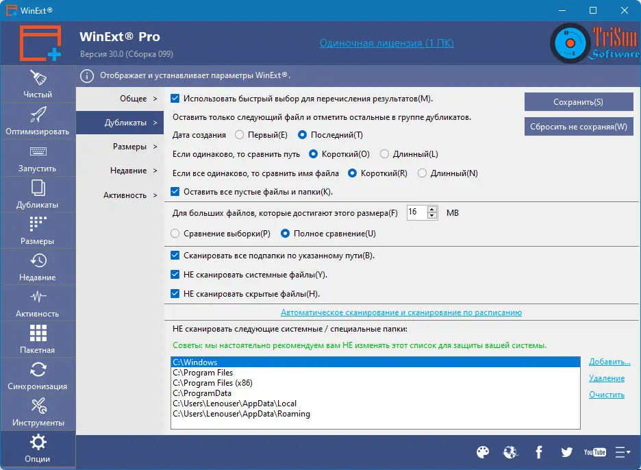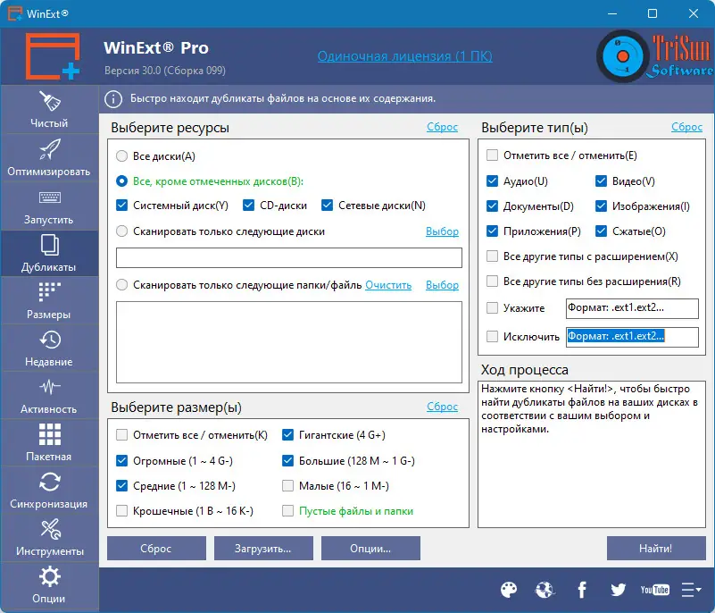 WinExt — это бесплатный набор системных утилит для операционной системы Windows, предназначенный для поиска дубликатов файлов, управления ресурсами, отслеживания изменений и синхронизации данных. Программа сочетает высокую точность, скорость обработки и удобный интерфейс, позволяя эффективно оптимизировать дисковое пространство и упрощать повседневные операции с файлами и папками.