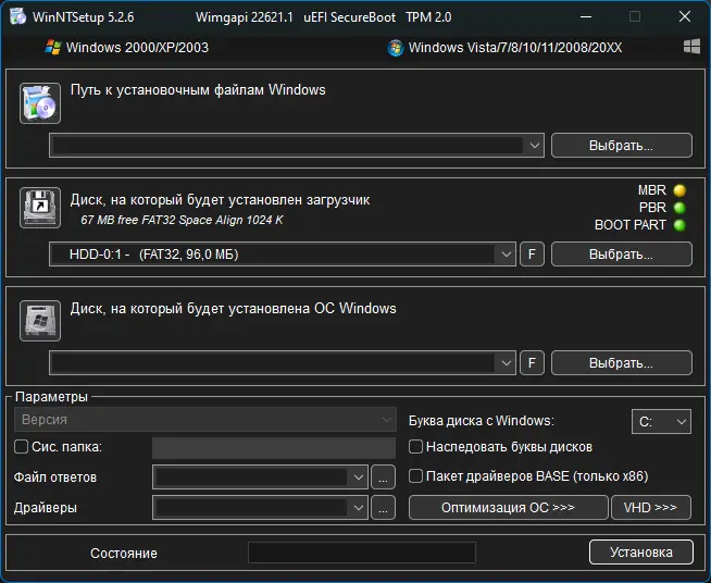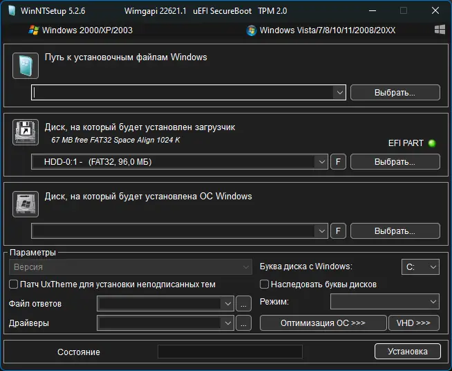 WinNTSetup — это альтернативный инструмент для установки Windows, разработанный как легковесная и быстрая замена стандартному процессу инсталляции. В отличие от классического установщика, он работает напрямую с образами WIM и ESD, позволяя развернуть систему за считанные минуты. Утилита поддерживает широкий спектр версий ОС, включая Windows 2000, XP, Vista, 7, 8.x, 10 и 11, как в 32-, так и в 64-битных конфигурациях. Она не требует установки и может запускаться с любого носителя, что делает её идеальной для аварийного восстановления или настройки систем в среде WinPE.