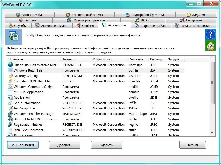 После запуска WinPatrol автоматически начинает сканирование ключевых точек системы, включая реестр, автозагрузку, службы и установленные браузерные расширения. Пользователь получает уведомления при любом изменении, требующем подтверждения, что позволяет оперативно реагировать на потенциальные угрозы. Конфигурация осуществляется через интуитивно понятный интерфейс, где можно настроить фильтры куки, управлять ассоциациями программ и расширений файлов, а также включить отображение скрытых файлов для более детального контроля.