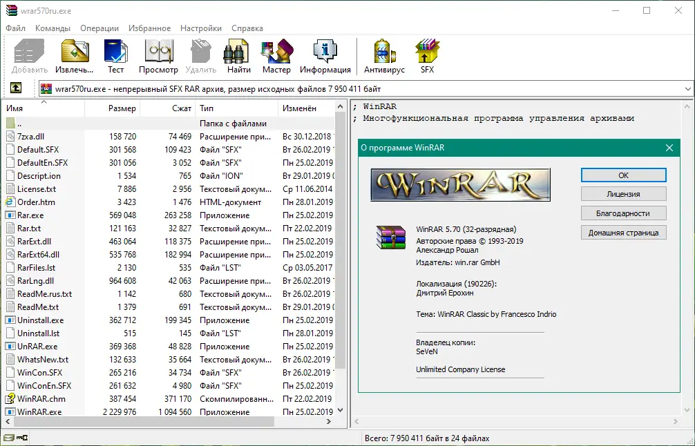 WinRAR — мощный архиватор, обеспечивающий высокую степень сжатия данных и поддержку множества форматов, включая RAR, ZIP, 7Z, ISO и другие. Программа подходит для работы с однотомными и многотомными архивами, поддерживает шифрование, восстановление повреждённых файлов и интеграцию в контекстное меню Windows. Совместима с операционными системами от Windows 7 до Windows 11, включая разрядности 32 и 64 бит.