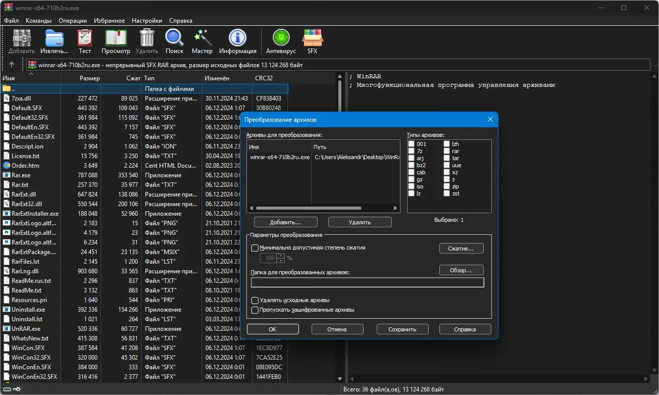 - Поддержка форматов RAR, ZIP, 7Z, ISO, TAR, GZ и других