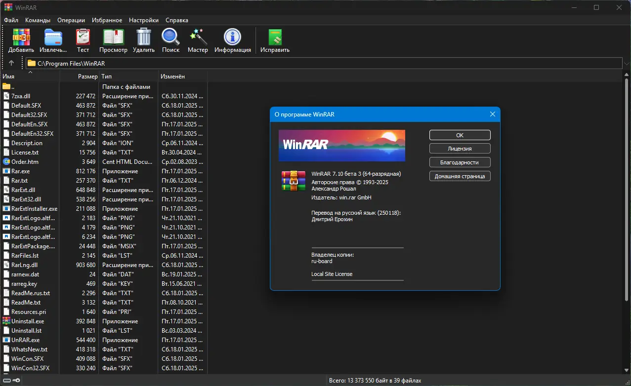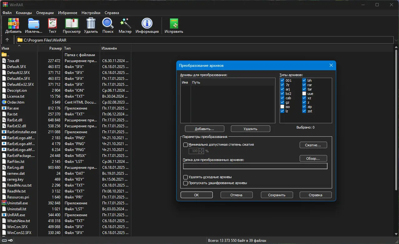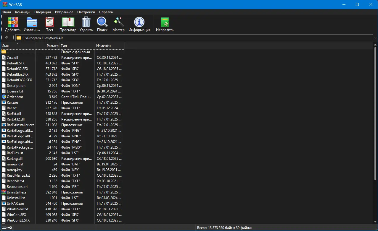 WinRAR — один из самых известных архиваторов, зарекомендовавший себя за годы использования в операционных системах на базе Windows. Он поддерживает собственный формат RAR, отличающийся высокой степенью сжатия и надёжностью хранения данных. Также программа эффективно работает с ZIP, CAB, ARJ, LZH, TAR, GZ, BZIP2, JAR, UUE, 7-Zip и другими форматами, что делает её универсальным инструментом для управления сжатыми файлами.
