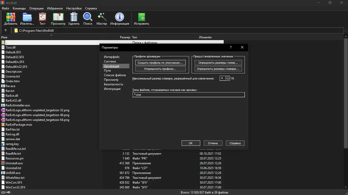 - Позволяет создавать самораспаковывающиеся архивы (SFX) для удобного распространения файлов.