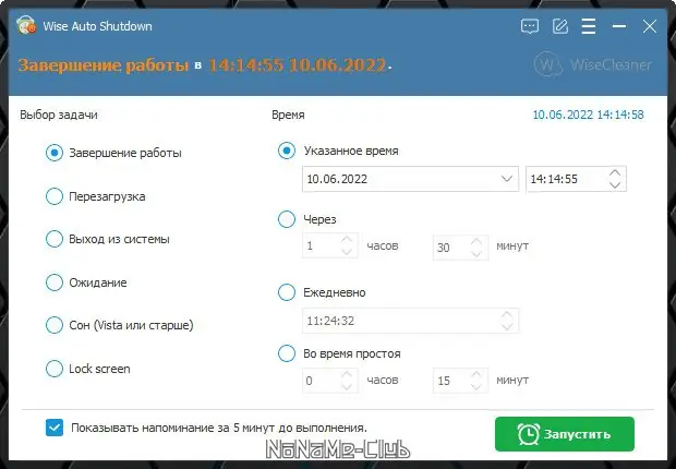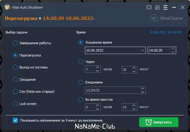 Программа Wise Auto Shutdown предназначена для автоматизации стандартных операций выключения и управления состоянием операционной системы. Она поддерживает несколько режимов: выключение, перезагрузка, спящий режим, гибернация, а также выход из учётной записи. Пользователь может задать время выполнения через календарь, ежедневное расписание или отсчёт от текущего момента, что делает инструмент гибким в использовании.
