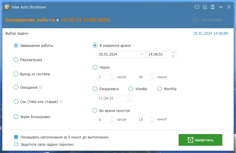 Wise Auto Shutdown — это легковесная утилита для автоматического управления выключением, перезагрузкой или переходом в спящий режим компьютера в заданное время. Программа идеально подходит для пользователей, которые хотят экономить электроэнергию или настраивать регулярные действия без постоянного контроля.
