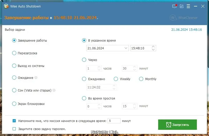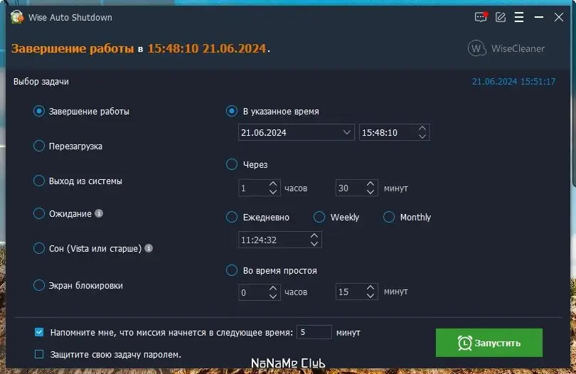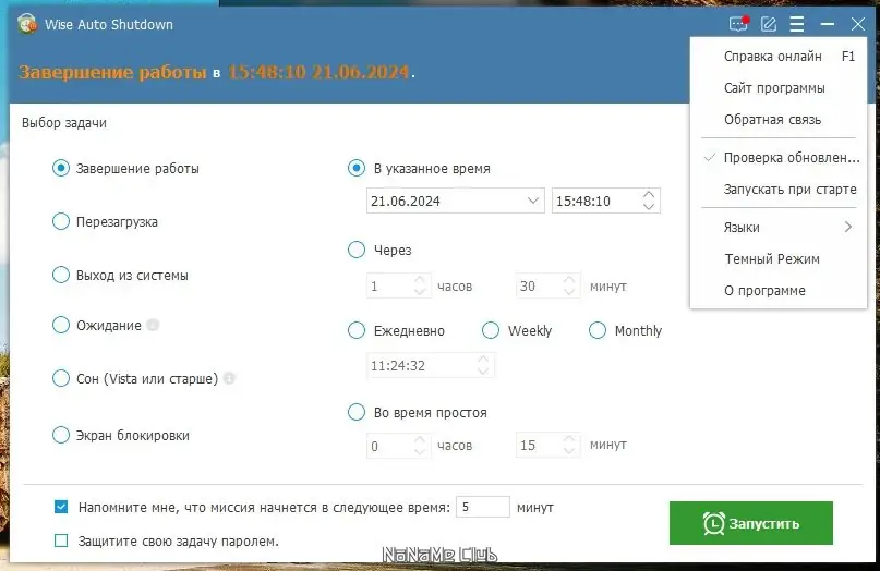 Wise Auto Shutdown предоставляет гибкие настройки для автоматического завершения работы системы в указанное время или через заданный интервал. Пользователь может выбрать один из нескольких режимов: выключение, перезагрузка, сон, гибернация, блокировка или выход из учётной записи. Утилита поддерживает разные способы установки времени — ежедневно, через определённое количество минут, или в конкретный момент суток, что делает её удобной как для повседневного использования, так и для разовых задач. При включённой опции программа выводит предупреждение за пять минут до выполнения команды, позволяя отменить действие при необходимости.