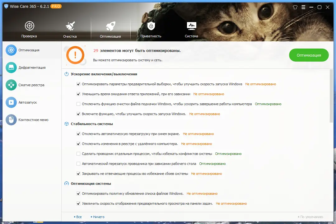 - Проводит анализ и дефрагментацию системного реестра для улучшения стабильности.