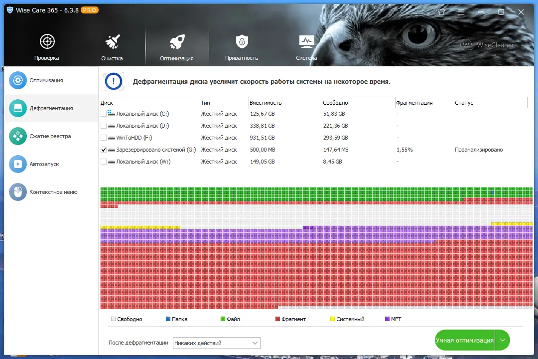 - Позволяет дефрагментировать как жёсткий диск, так и сам реестр, улучшая скорость доступа к данным.