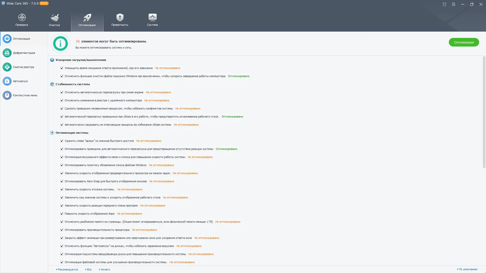 Wise Care 365 — это многофункциональный инструмент в категории системных утилит, разработанный для комплексной оптимизации операционной системы. Он включает модули по очистке реестра, дефрагментации жёстких дисков, управлению памятью и настройке автозагрузки, а также предоставляет средства для восстановления удалённых файлов и защиты личной информации. Интерфейс утилиты интуитивно понятен, а встроенные алгоритмы позволяют автоматизировать большинство процессов обслуживания компьютера.