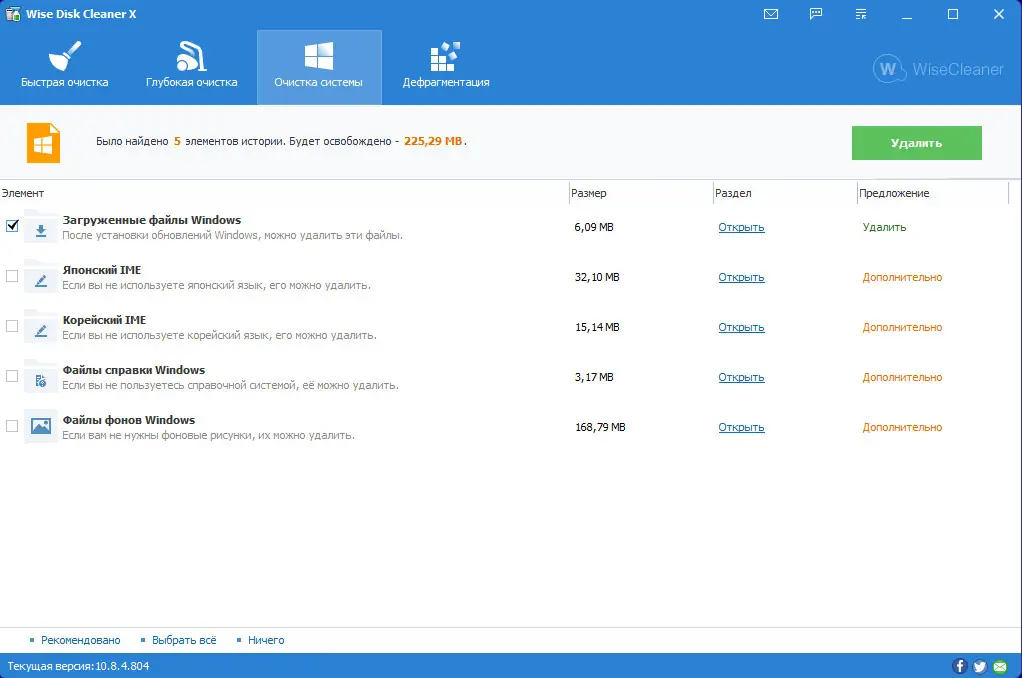 Wise Disk Cleaner — это надежная утилита для очистки дисков от временных, ненужных и мусорных файлов, способная ускорить работу системы и освободить значительное количество места на жёстком диске. Программа поддерживает более 50 типов файлов-загрязнителей и позволяет пользователю точно выбирать, что удалять, обеспечивая безопасность и контроль над процессом.