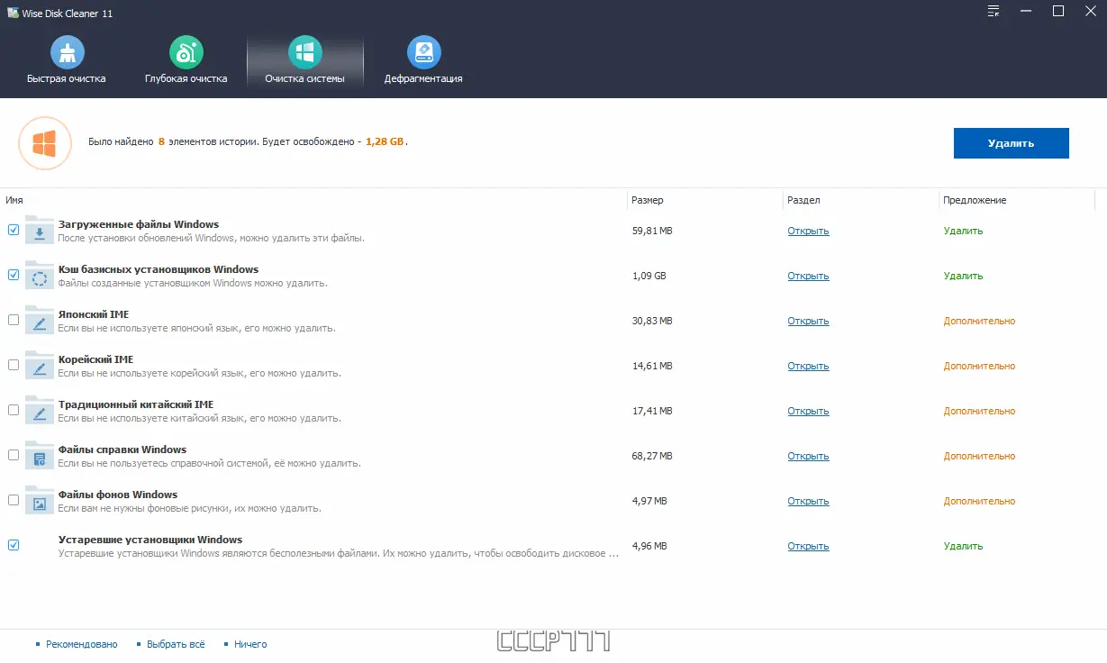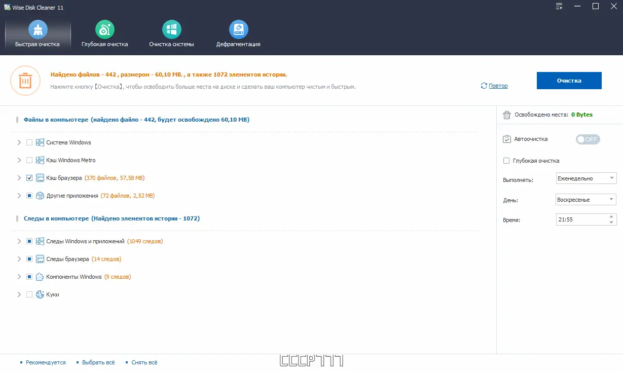 - Осуществляет глубокое сканирование дисков на наличие временных и ненужных файлов.
