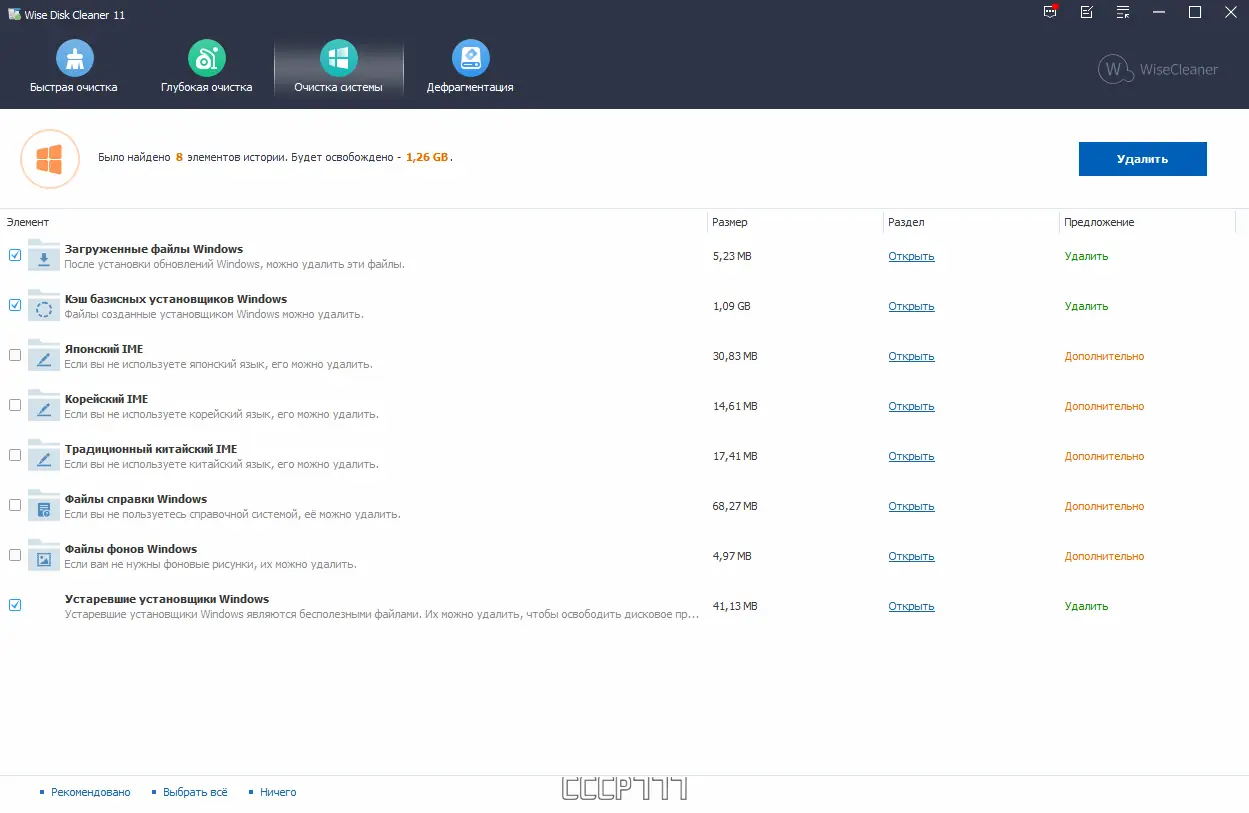 - Осуществляет сканирование и очистку жестких дисков от ненужных и временных файлов, включая остатки программ и системные логи.