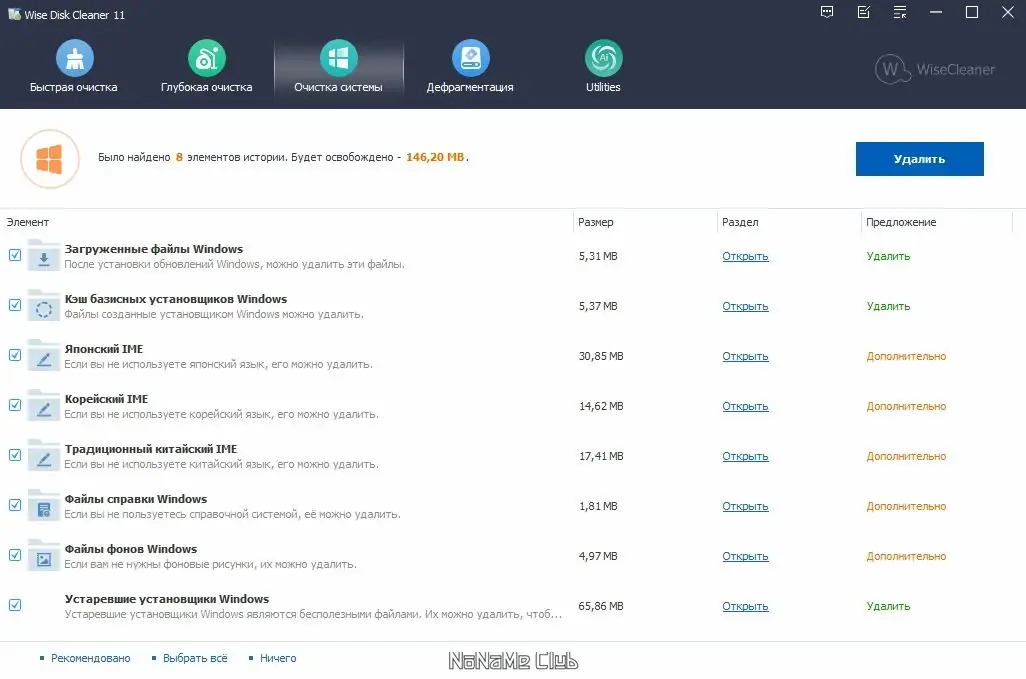 - Осуществляет сканирование дисков на наличие временных, кэшированных и ненужных файлов, включая остатки удалённых программ и журналы системы.