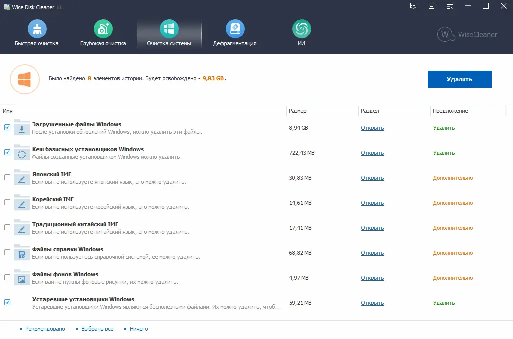 Wise Disk Cleaner — это компактная и эффективная утилита для очистки дисков от временных, ненужных и остаточных файлов, способная ускорить работу системы и освободить ценное дисковое пространство. Программа поддерживает более 50 типов мусорных файлов, включая кэш браузеров, логи, временные данные приложений и файлы обновлений. Пользователь может настроить процесс сканирования, просматривать найденные элементы и выбирать, что удалять, а что оставить. Простой интерфейс и высокая скорость анализа делают её подходящей как для новичков, так и для опытных пользователей. Инструмент не требует сложной настройки и работает без риска для системных компонентов.