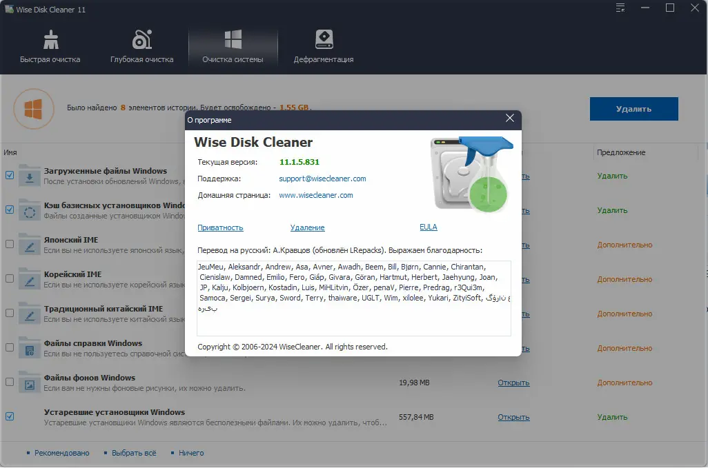 Wise Disk Cleaner — это эффективная утилита для очистки жестких дисков от временных, ненужных и мусорных файлов, способствующая ускорению работы системы и освобождению дискового пространства. Программа поддерживает сканирование более чем 50 типов нежелательных данных, включая кэш браузеров, логи, остатки удалённых программ и другие следы активности. Её интерфейс прост и интуитивно понятен, что делает использование доступным даже для новичков.