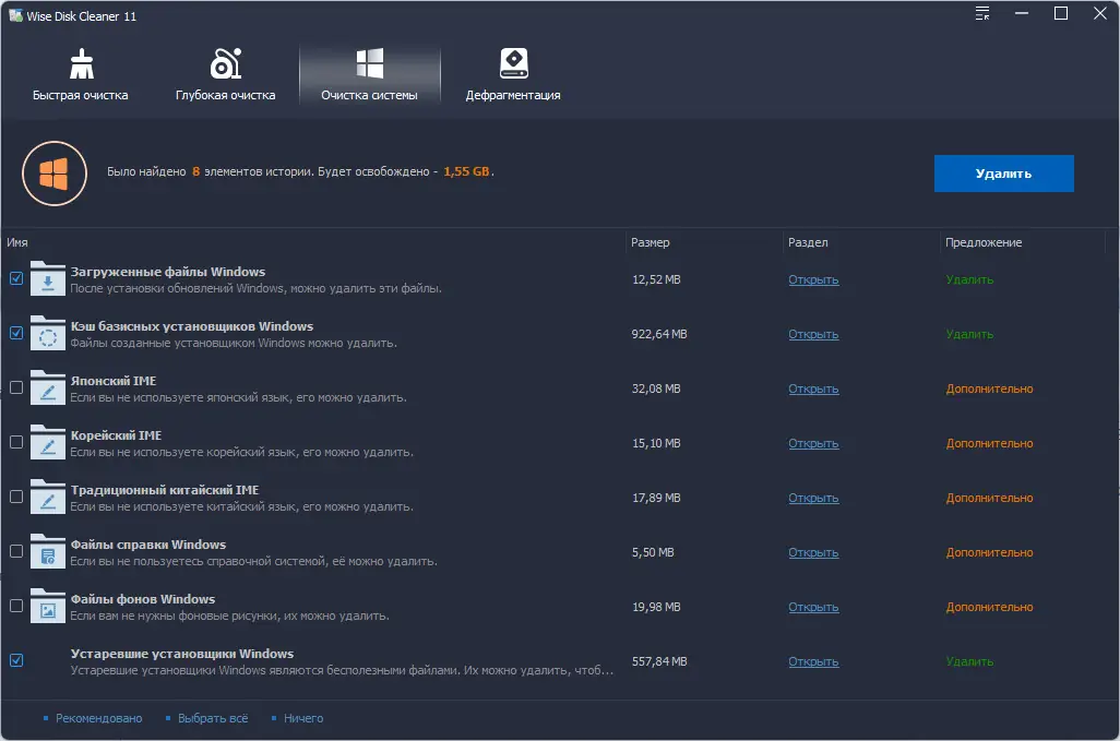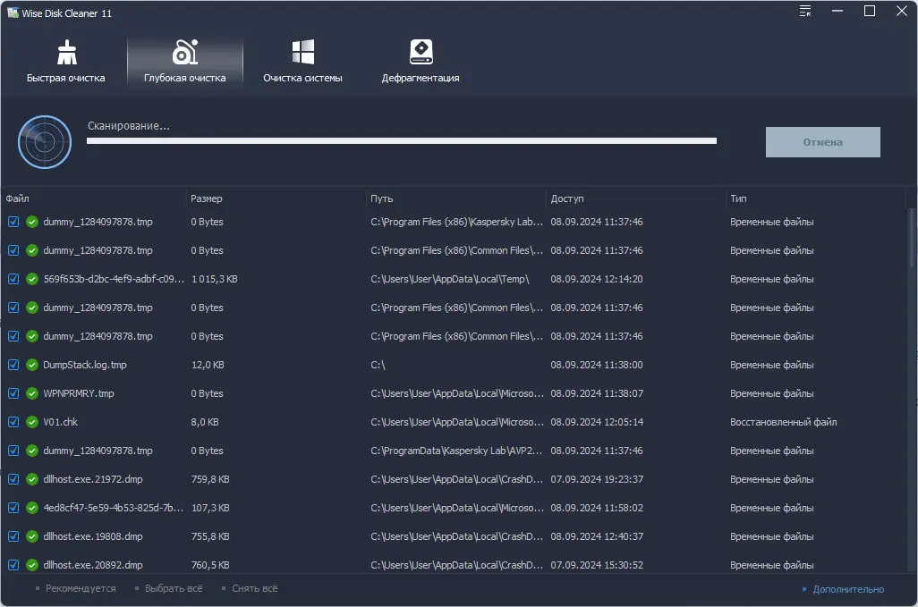 Использование Wise Disk Cleaner не требует специальных знаний. После запуска достаточно выбрать тип сканирования — базовый или глубокий — и нажать кнопку «Сканировать». По завершении процесса откроется окно с перечнем найденных файлов, сгруппированных по категориям. Пользователь может просмотреть каждый элемент, оценить его размер и важность, после чего отметить нужные для удаления и подтвердить действие.