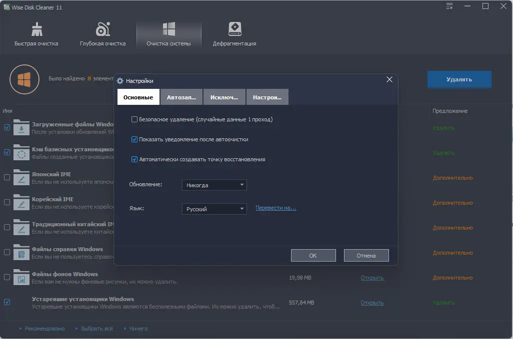 - Гибкие настройки удаления: файлы можно отправлять в корзину или удалять безвозвратно