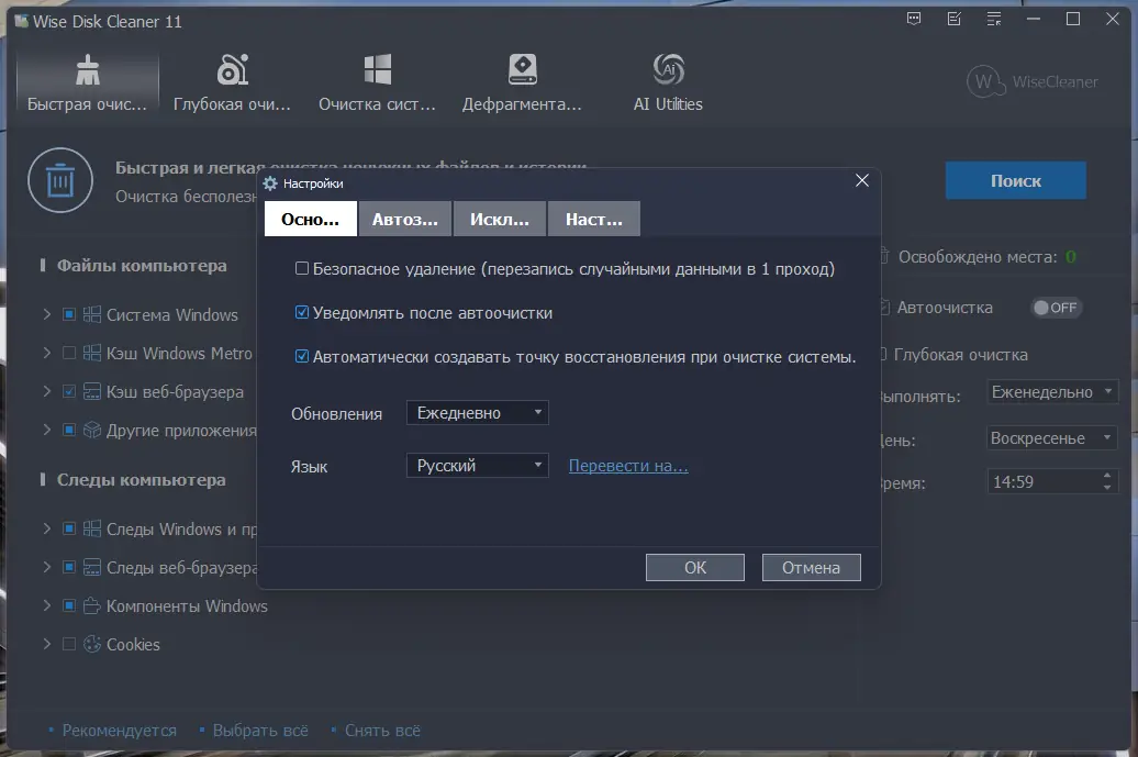 - Осуществляет глубокое сканирование системных и пользовательских папок на наличие временных файлов.