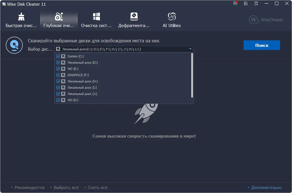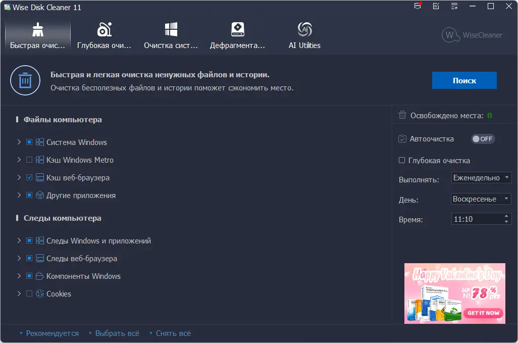 Wise Disk Cleaner — это надёжная утилита для очистки дисков от временных, ненужных и остаточных файлов, способствующая ускорению работы системы и освобождению дискового пространства. Программа анализирует более 50 типов мусорных данных, включая кэш браузеров, логи, остатки удалённых приложений и временные системные файлы. Поддержка ручного выбора объектов для удаления и возможность добавления пользовательских форматов делают процесс настройки гибким и безопасным.
