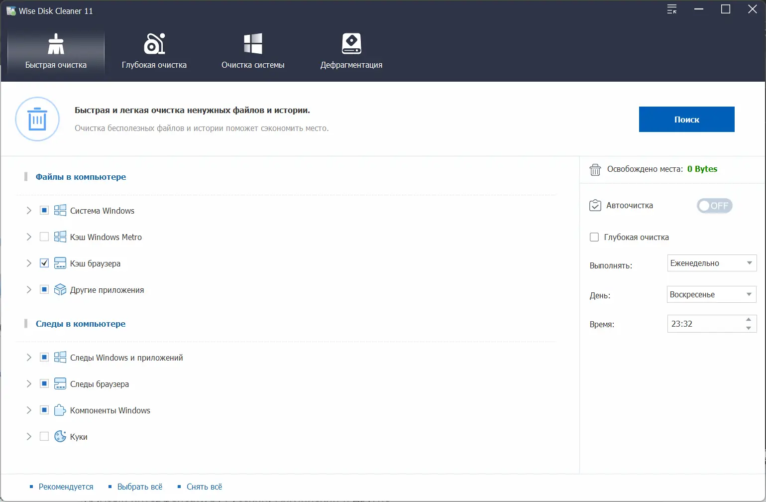 Wise Disk Cleaner — это инструмент для глубокой очистки жёстких дисков от временных, кэшированных и ненужных файлов, способствующий ускорению работы системы и освобождению дискового пространства. Программа поддерживает более 50 форматов мусорных файлов и позволяет вручную добавлять новые типы для поиска. Процесс сканирования быстрый, безопасный и сопровождается детальным анализом каждого найденного элемента.